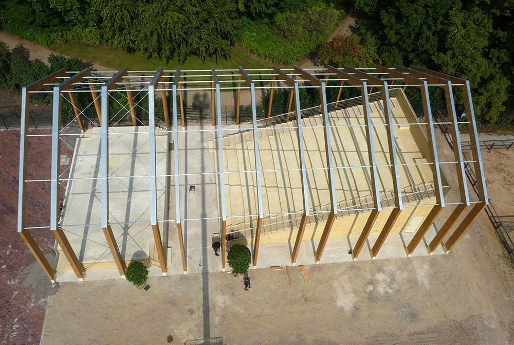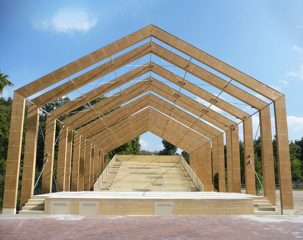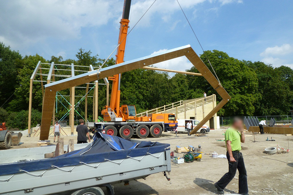 Leistungen: Leimbinder-Konstruktion, Holzmontage, Hallenbau, Kerto Schichtholz
